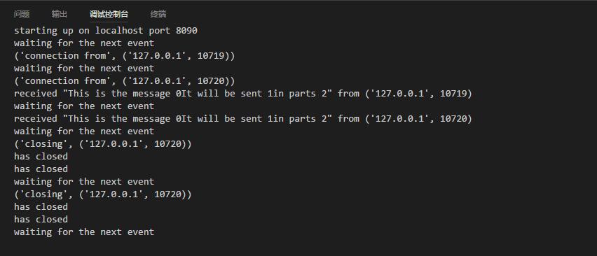 写代码过程中遇到了两个问题, 一是如何判断客户端已经关闭了socket连接, 后来自己分析了下, 如果关闭了客户端socket, 那么此时服务器端接收到的data就是'', 加个这个判断。二是如果服务器端关闭了socket, 一旦在调用socket的相关方法都会报错, 不管socket是不是用不同的容器存储的(意思是说list_1存储了socket1, list_2存储了socket1, 我关闭了socket1, 两者都不能在调用这个socket了)