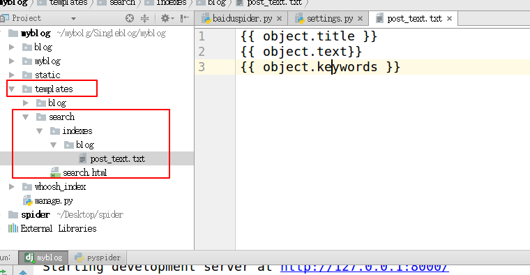 3. 在templates目录下创建“search/indexes/blog/”目录 采用blog应用名字下面创建一个文件blog_text.txt