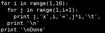for i in range(1,10): for j in range(1,i+1): print j,'x',i,'=',j*i,'\t', print '\n' print '\nDone'