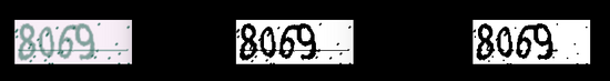 从左到右依次是原图、二值化、去除干扰线的情况,总体降噪的效果还是比较明显的。另外降噪可以多次执行,比如我对上面的降噪后结果再进行依次降噪,可以得到下面的效果: