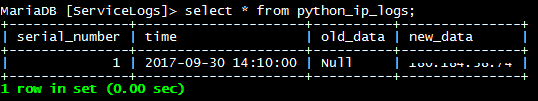 MariaDB [(none)]> CREATE TABLE `python_ip_logs` ( `serial_number` bigint(20) NOT NULL AUTO_INCREMENT, `time` datetime DEFAULT NULL, `old_data` varchar(50) DEFAULT NULL, `new_data` varchar(50) DEFAULT NULL, PRIMARY KEY (`serial_number`) ) ENGINE=InnoDB AUTO_INCREMENT=3 DEFAULT CHARSET=latin1