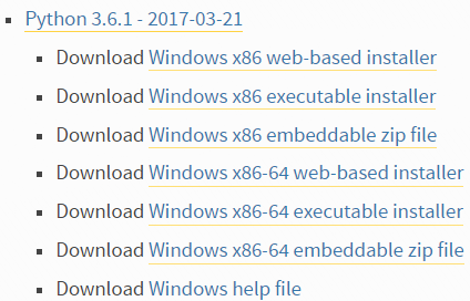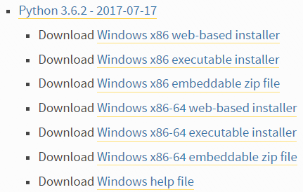 之前在电脑上安装了python3.6.2(目前是最新版),可以看到,是2017-07-17才出的。因此,我发现有三个重要的包:Scrapy、PyQt和TensorFlow都还没有适配python3.6.2版本。无奈之下,只能卸载python3.6.2,安装稍微老一点的python3.6.1。另附Windows下python下载地址