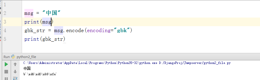 #-*- coding:utf-8 -*- msg = "中国" print msg #解码在编码的过程,encoding是申明用申明这段代码是什么编码 gbk_str = msg.decode(encoding='utf-8').encode(encoding='gbk') print gbk_str #其实两种输出的结果是一样的