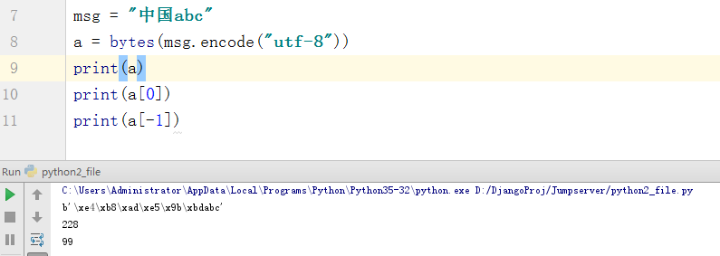 在这一幅图中我们看到中国被传成了一堆看不懂的鸟文。而英文还是显示出来了。但是我们通过列表的截取,看出最后一位的c输出的是99,其实这里输出的就是ASCII中c对应的位置,而3个bytes是一个中文,所以我们看到了6段鸟文字,这里我们就不过多解释了。