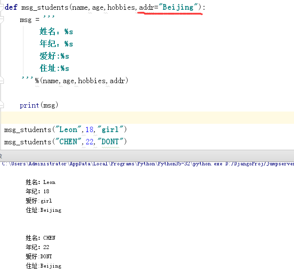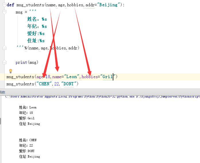 像上面这样实参和形参不一一对应,并且在调用函数的时候给参数赋值的叫做关键参数