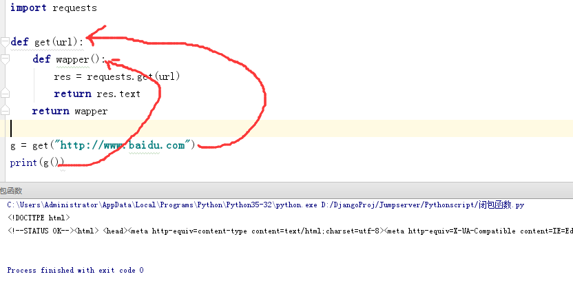 g = get("http://www.baidu.com") #调用:首先因为作用域的原因,我们无法访问到里层的wapper函数,所以我们直接调用get函数这里返回了一个wapper函数