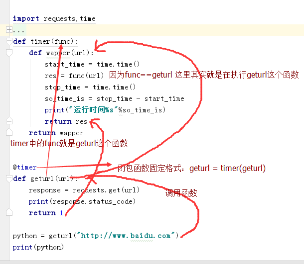 分析geturl=timer(geturl),首先我们可以得知timer这是一个闭包函数,当我们执行这个闭包函数,会把里层的函数(wapper)返回,也就是说timer(geturl)其实就是返回的wapper,所以就可以这样理解了geturl==wapper,所以当我们运行geturl的时候就相当于在执行wapper()这样的一个操作;如果这里实在记不住,就这样。咱上面不是有一个闭包函数吗?你就把geturl=timer(geturl)中的geturl(执行函数的返回结果)当做上面g(函数调用的返回结果),然后在分别再执行了下"g"或者"geturl”这个对象。