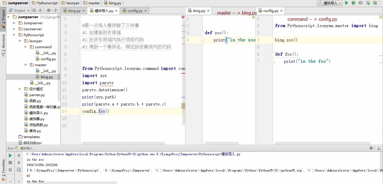 上图中我运行“模块导入.py”这个文件夹,首先我from Pythonscript.leonyan.command import config,因为我们得运行脚本和需要导入的包都在Pythonscript的目录下面所以我直接通过绝对路径导入,然后一层一层“.”下去,知道最后import了这个config文件,这里我们需要注意一点:当脚本在最外层运行的时候sys.path 列表中的第一个参数就是运行脚本的目录,这是什么意思,这代表着你在别的包中有调用了其他的东西比如说我的config.py是调用了bing.py文件,这时候就必须写绝对路径,因为这在sys.path文件夹中已经找不到了,也就是导入不进来。