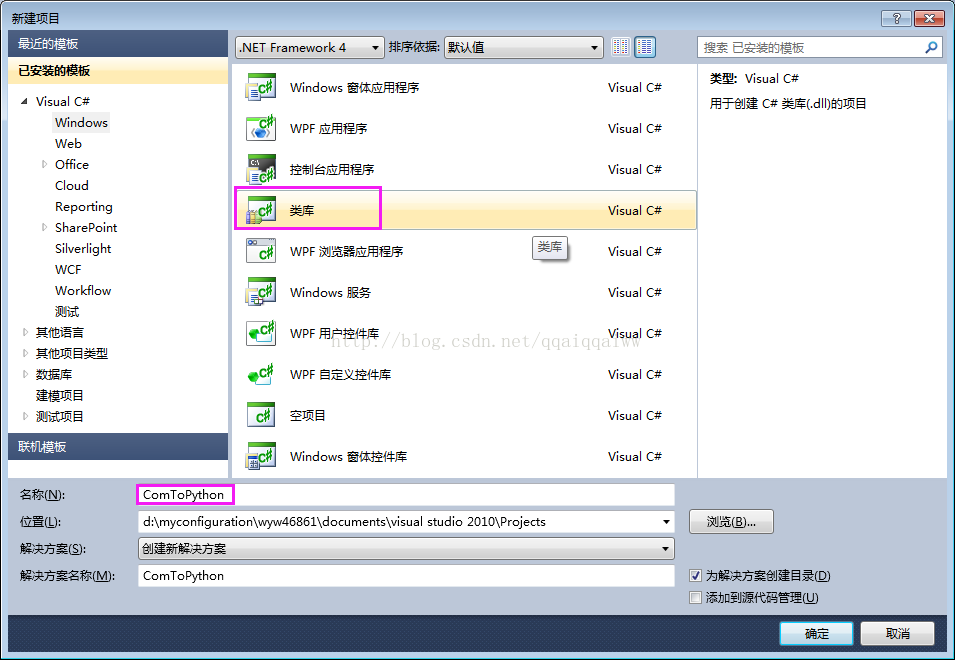 我用的是Microsoft visual studio 2010, 首先新建--项目--选择【类库】,名称自定义:ComToPython,点击【确定】