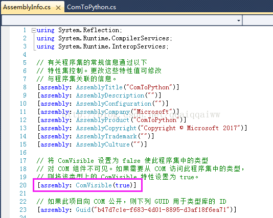 [ProgId("ComToPython.Application")]指定Python调用COM时的名称,后面Python代码会看到。