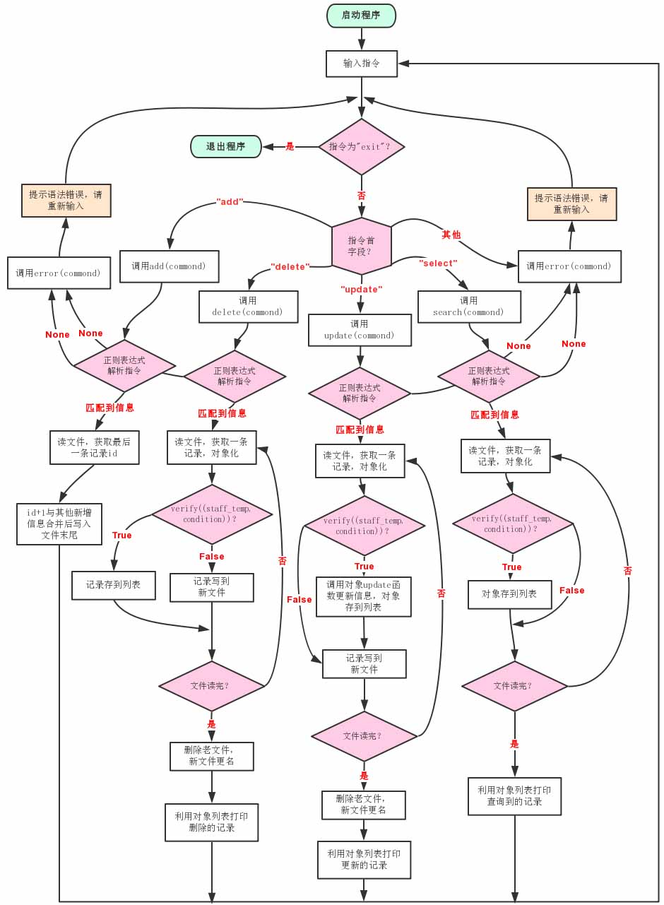 本程序采用python语言编写,关键在于指令的解析和执行:其中指令解析主要运用了正则表达式来高效匹配有效信息;指令执行通过一个commd_exe主执行函数和增、删、改、查4个子执行函数来实现,操作方法主要是运用面向对象方法将员工信息对象化,从而使各项操作都能方便高效实现。程序主要函数如下: