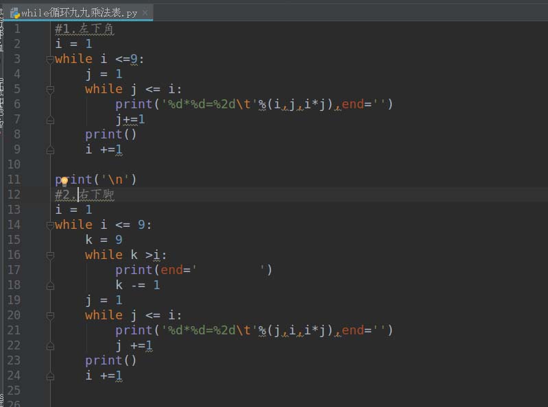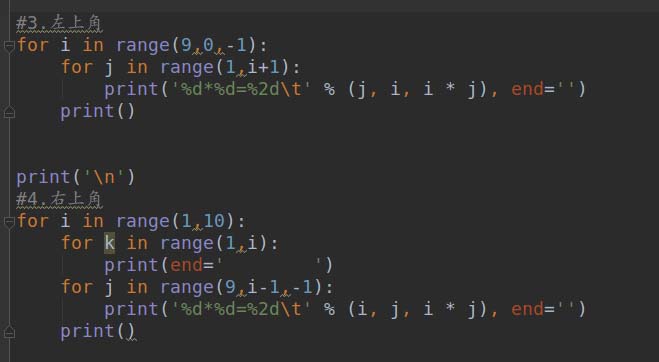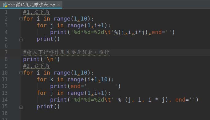 以上这篇利用Python循环(包括while&for)各种打印九九乘法表的实例就是小编分享给大家的全部内容了,希望能给大家一个参考,也希望大家多多支持脚本之家。