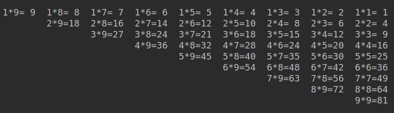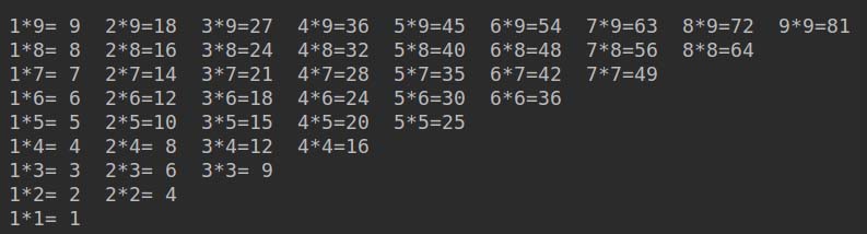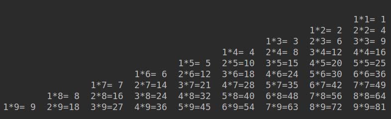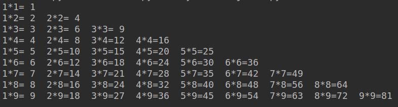 print('%d*%d=%2d\t' % (i, j, i * j), end='')