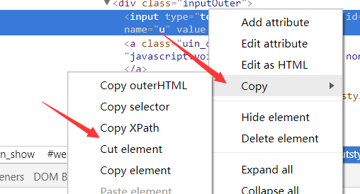 通过这些基本可以定位,有些没有这些Attribute的,还可以通过Xpath等定位,操作如下:在之前检查找到的代码那里右键 ——>> Copy ——>> Copy Xpath(其他类似)