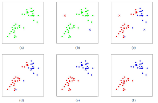 下图展示了对n个样本点进行K-means聚类的效果,这里k取2。