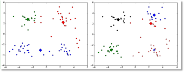 (1)k值的选择是用户指定的,不同的k得到的结果会有挺大的不同,如下图所示,左边是k=3的结果,这个就太稀疏了,蓝色的那个簇其实是可以再划分成两个簇的。而右图是k=5的结果,可以看到红色菱形和蓝色菱形这两个簇应该是可以合并成一个簇的: