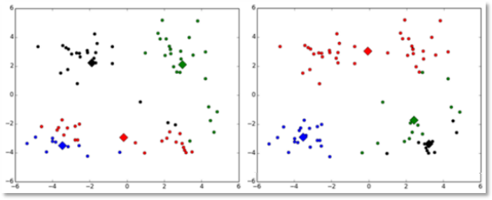 (2)对k个初始质心的选择比较敏感,容易陷入局部最小值。例如,我们上面的算法运行的时候,有可能会得到不同的结果,如下面这两种情况。K-means也是收敛了,只是收敛到了局部最小值: