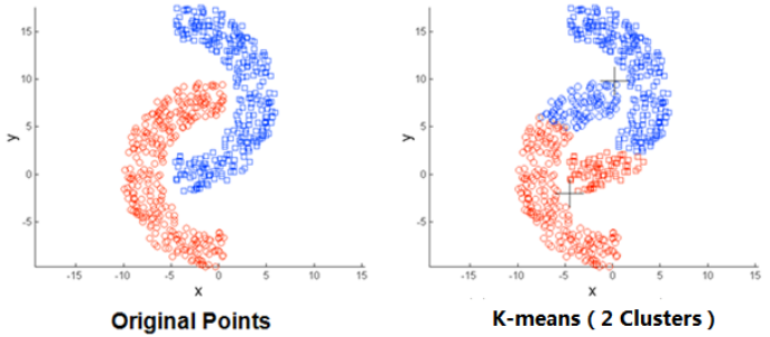 (3)存在局限性,如下面这种非球状的数据分布就搞不定了: