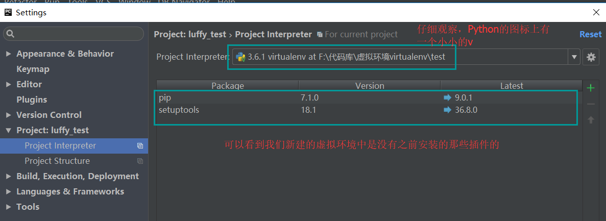 此时的环境中是没有插件的,因为我们创建这个虚拟环境的时候是选择 no-site-packages