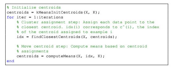 tmp = zeros(K,1); for i = 1:size(X,1) for j = 1:K tmp(j) = sum((X(i,:) - centroids(j,:)).^2); end [mins,index]=min(tmp); idx(i) = index; end