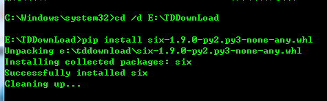 然后下载这个文件:six‑1.9.0‑py2.py3‑none‑any.whl,下载后,利用CMD进入到该文件所在的目录(DOS命令为:cd /d XX:/XXX/six‑1.9.0‑py2.py3‑none‑any.whl 把你自己的six文件的所在路径按格式粘贴进DOS然后回车就行了),然后输入命令:pip install six-1.9.0-py2.py3-none-any.whl,等DOS命令跑完,six不存在的问题就解决了。操作图如下: