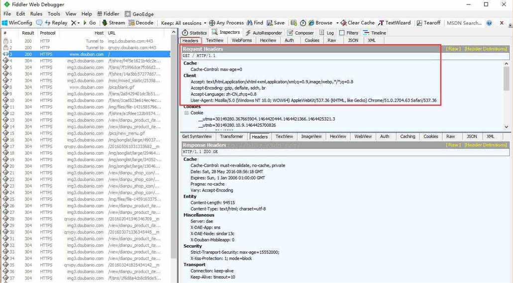 打开工具Fiddler,然后再浏览器访问“https://www.douban.com/”,在Fiddler左侧访问记录中,找到“200 HTTPS www.douban.com”这一条,点击查看其对应的请求和响应报头具体内容: