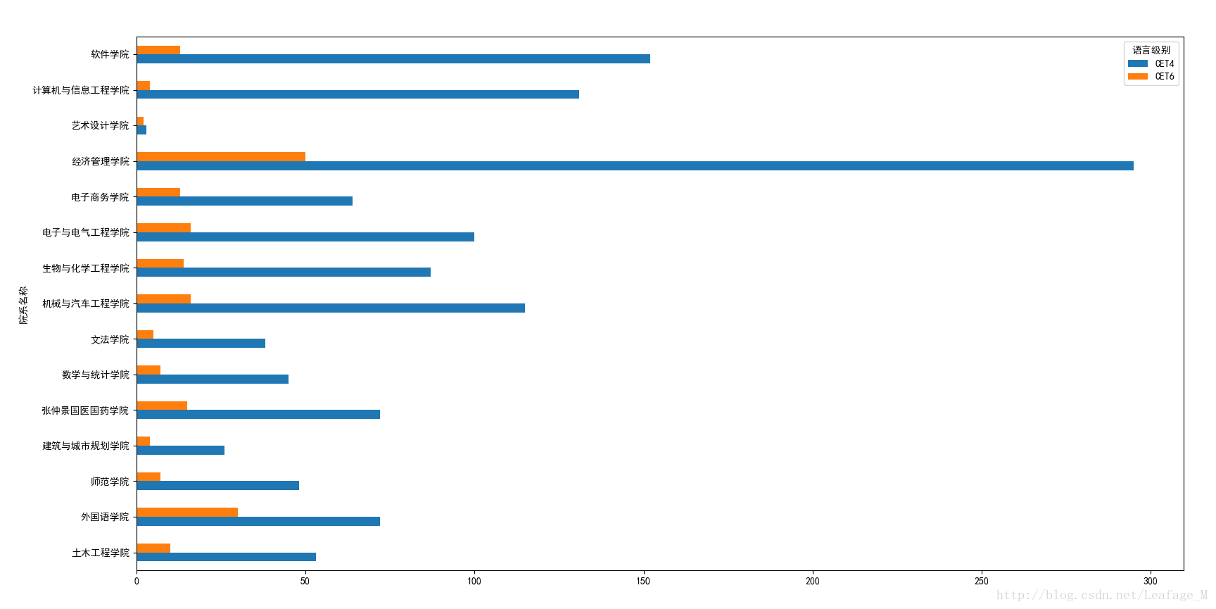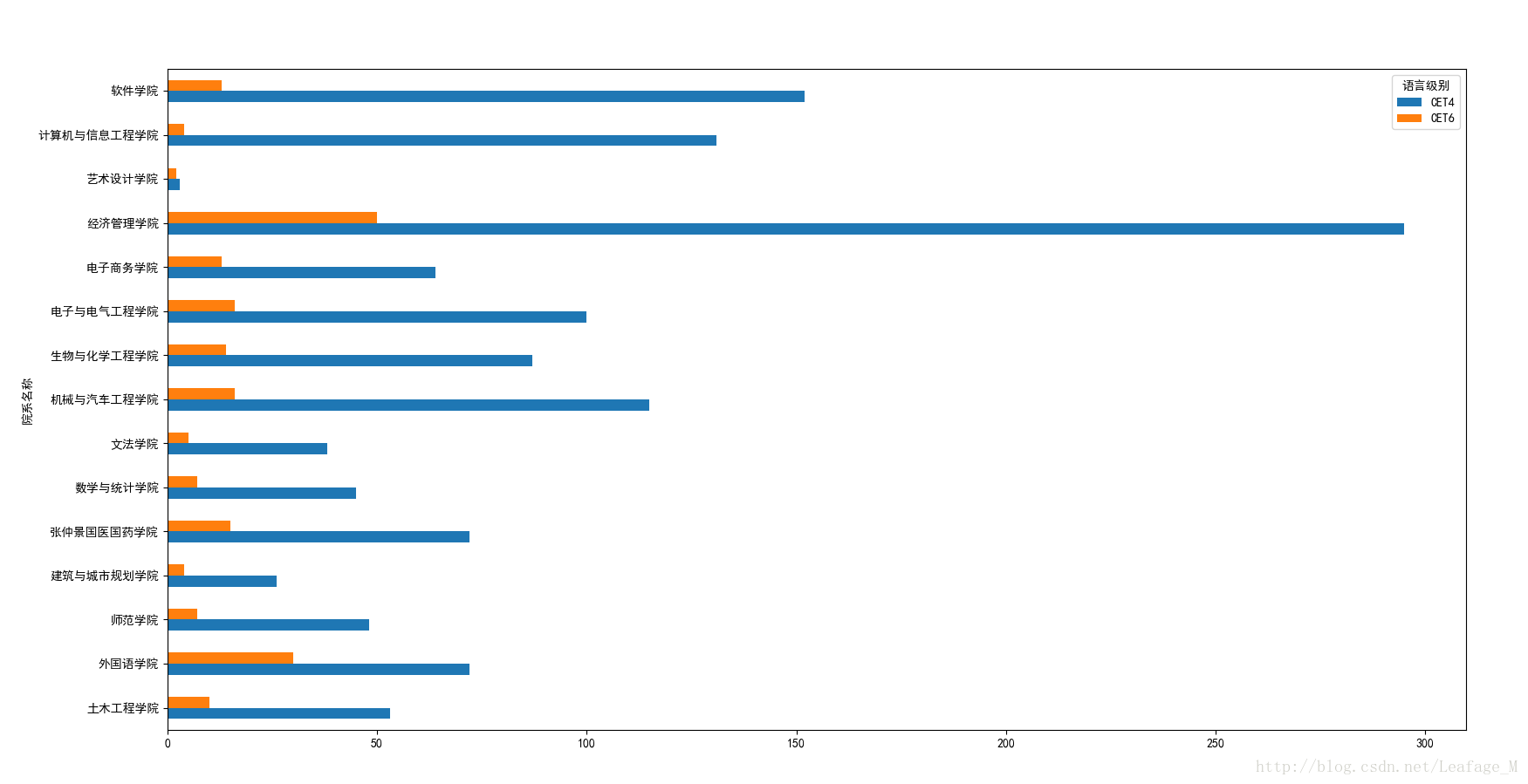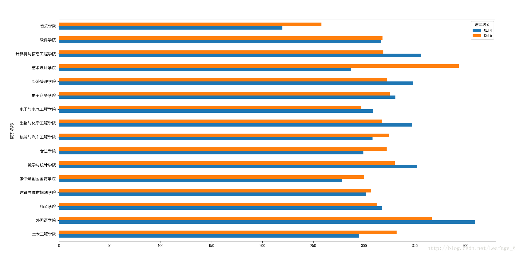 #按照各个学院进行分组 xypass = sjpass['总分'].groupby([sjpass['院系名称'],sjpass['语言级别']]) #计算各个学院的过关总人数 xypass = xypass.count() #将语言级别作为columns xypass = xypass.unstack(level='语言级别') #进行绘图 xypass.plot(kind='barh') plt.show()