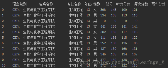 成绩表中包含的字段十分详细,里面有年级、性别、姓名、分数等等的一系列内容,我只想简单的分析一下我们学校的四六级过关率而已,所以去除了一些不必要的字段。留下的有如下几个字段: