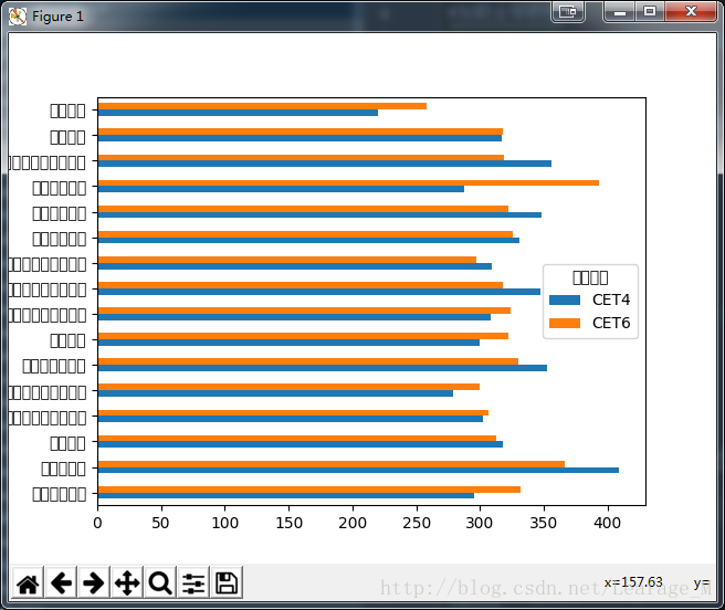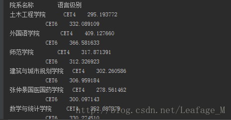 想要各个学院的情况当然是要根据学院来进行分组了,同时也需要分出“CET4”和“CET6”两组。使用groupby即可,这样会生成一个SeriesGroupBy对象,然后再调用mean函数(默认是轴0计算,也就是我们想要的结果)即可统计出平均分情况。