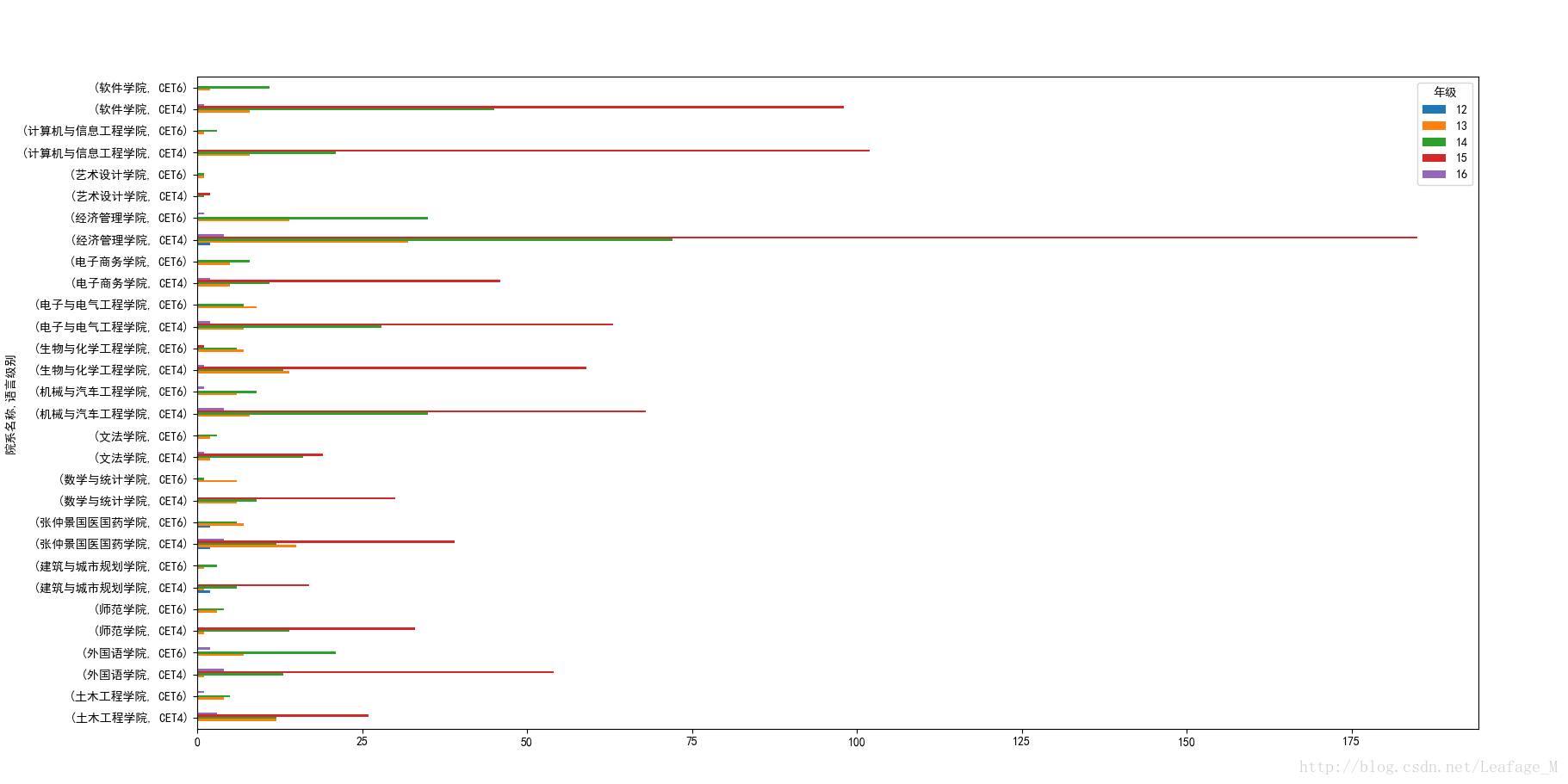 #按照各个学院和年级进行分组 xypass = sjpass['总分'].groupby([sjpass['院系名称'],sjpass['语言级别'],sjpass['年级']]) #计算各个学院的过关总人数 xypass = xypass.count() #将语言级别作为columns,并且将缺失值用0进行填充 xypass = xypass.unstack(level='年级').fillna(0) xypass.plot(kind='barh') plt.show()
