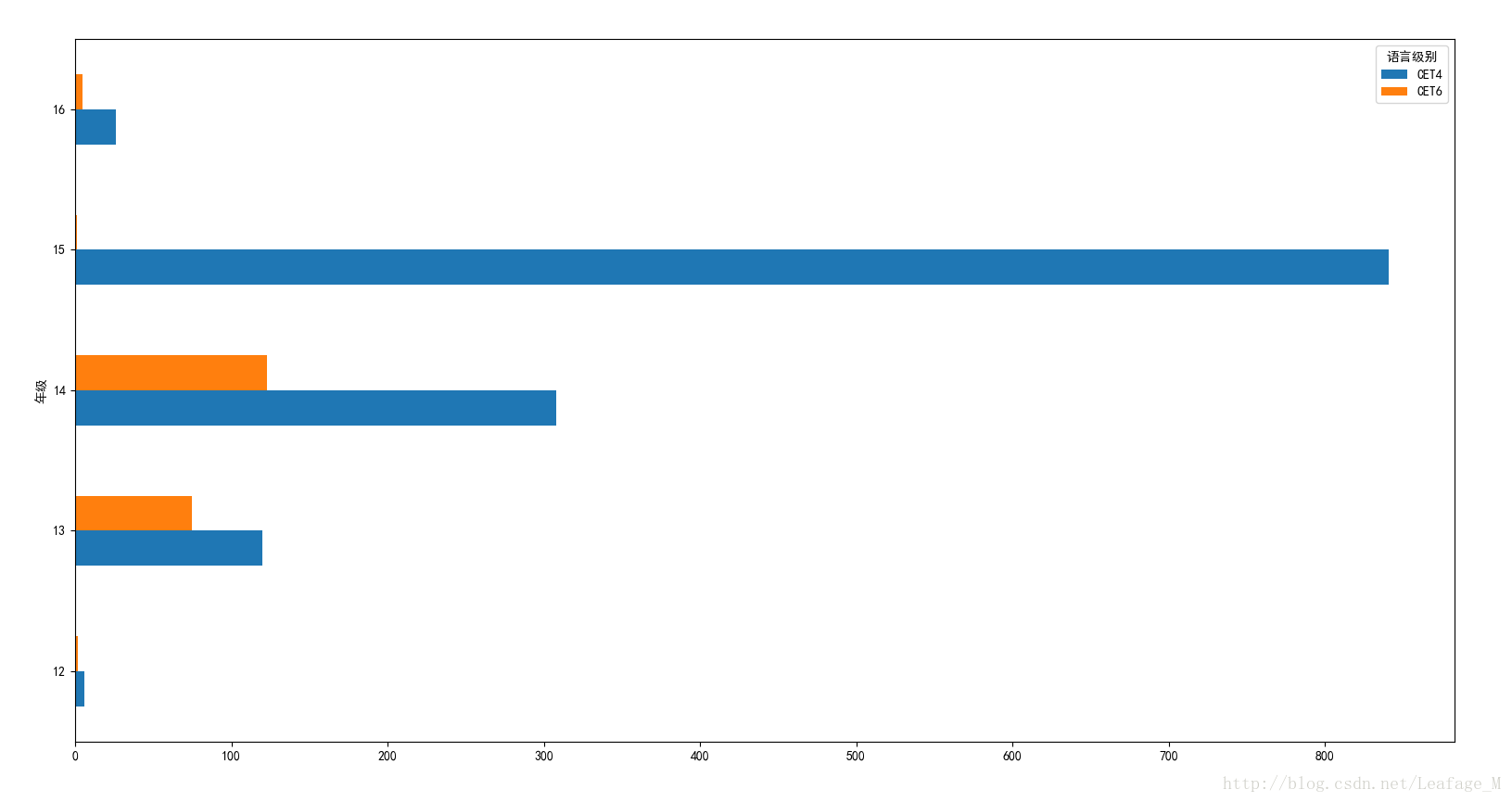 #-----------------各个年级过关人数------------------ njpass = sjpass['总分'].groupby([sjpass['年级'],sjpass['语言级别']]).count().unstack(level='语言级别') njpass.plot(kind='barh') plt.show()