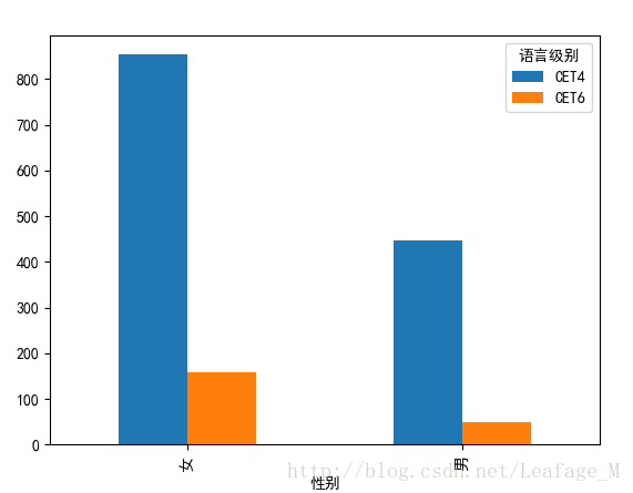 #---------------男生女生过关情况---------------------- nvpass = sjpass['总分'].groupby([sjpass['性别'],sjpass['语言级别']]).count().unstack(level='语言级别') nvpass.plot(kind='bar') plt.show()