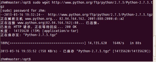 打开ubuntu下的shell终端,通过wget命令下载python源码包,如下图所示: