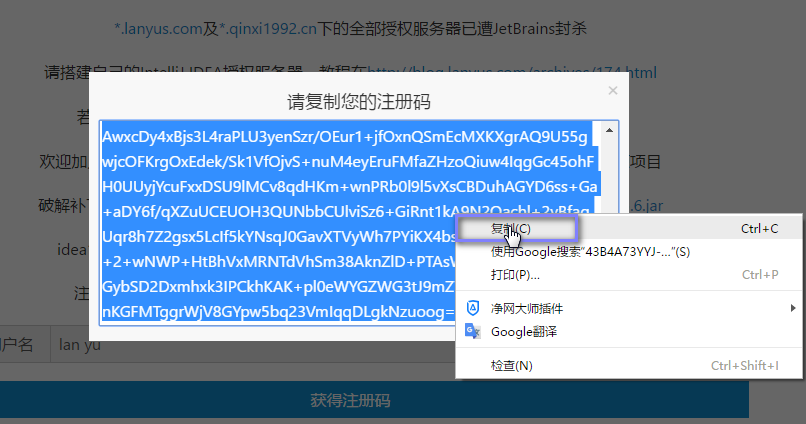 点击获取激活码后,文本默认是全选中的,直接右击选择复制即可。