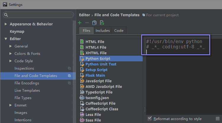 7、修改新建*.py文件的模版,首行添加默认解释器(方便在Linux运行),添加文件编码。
