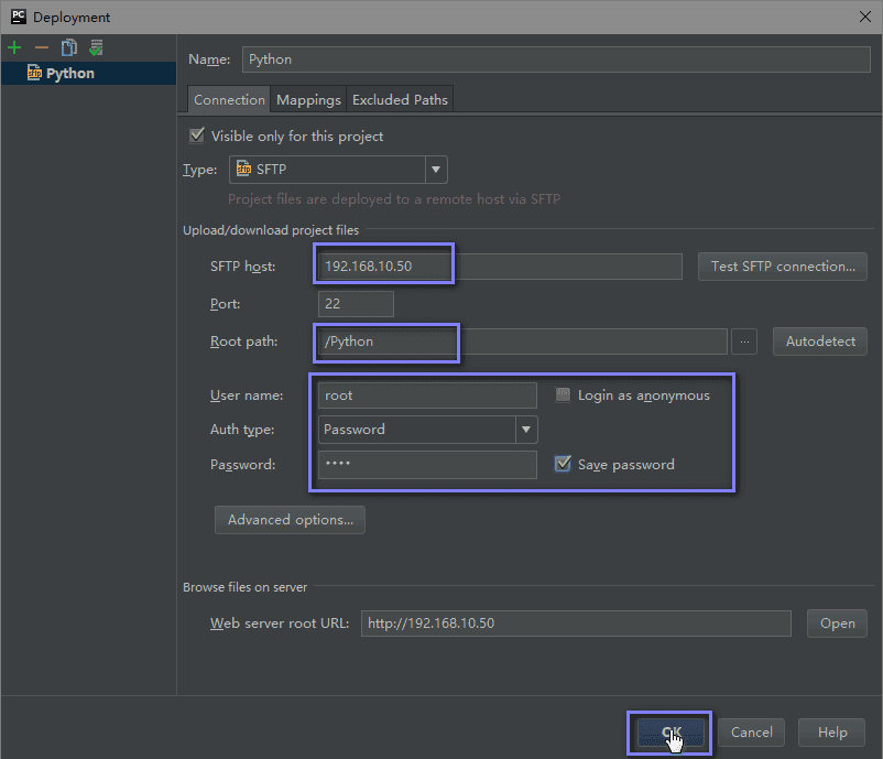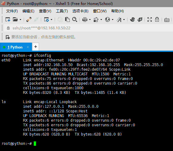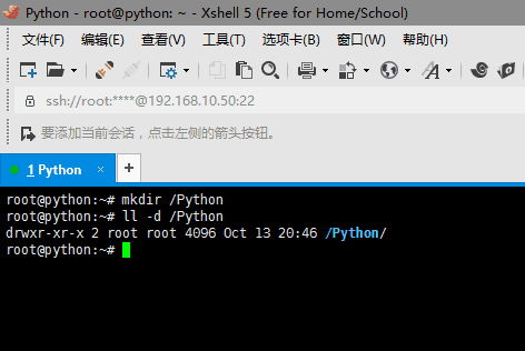 在这里我使用虚拟机假装远程服务器(尴尬),虚拟机IP地址:192.168.10.50,使用XShell(ssh协议)连接服务器(虚拟机),使用PyCharm(sftp协议)连接服务器(虚拟机)。