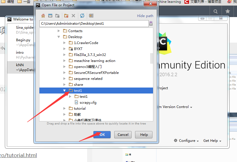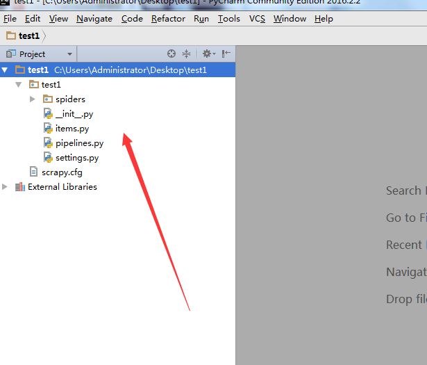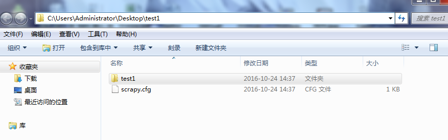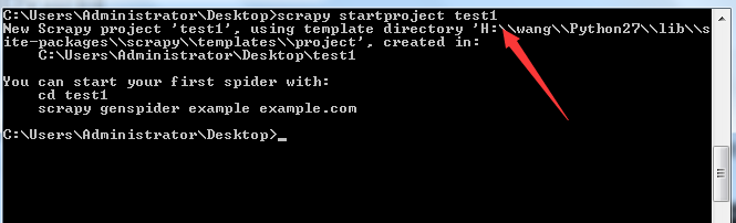 首先得有一个Scrapy项目,我在Desktop上新建一个Scrapy的项目叫test,在Desktop目录打开命令行,键入命令:scrapy startproject test1