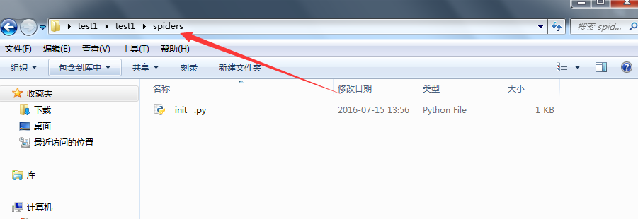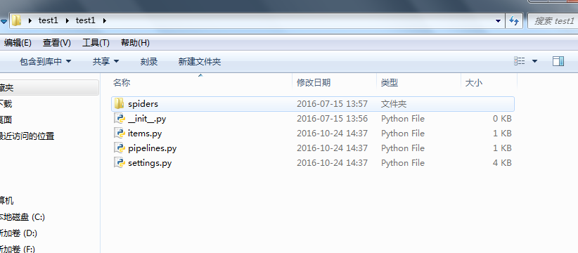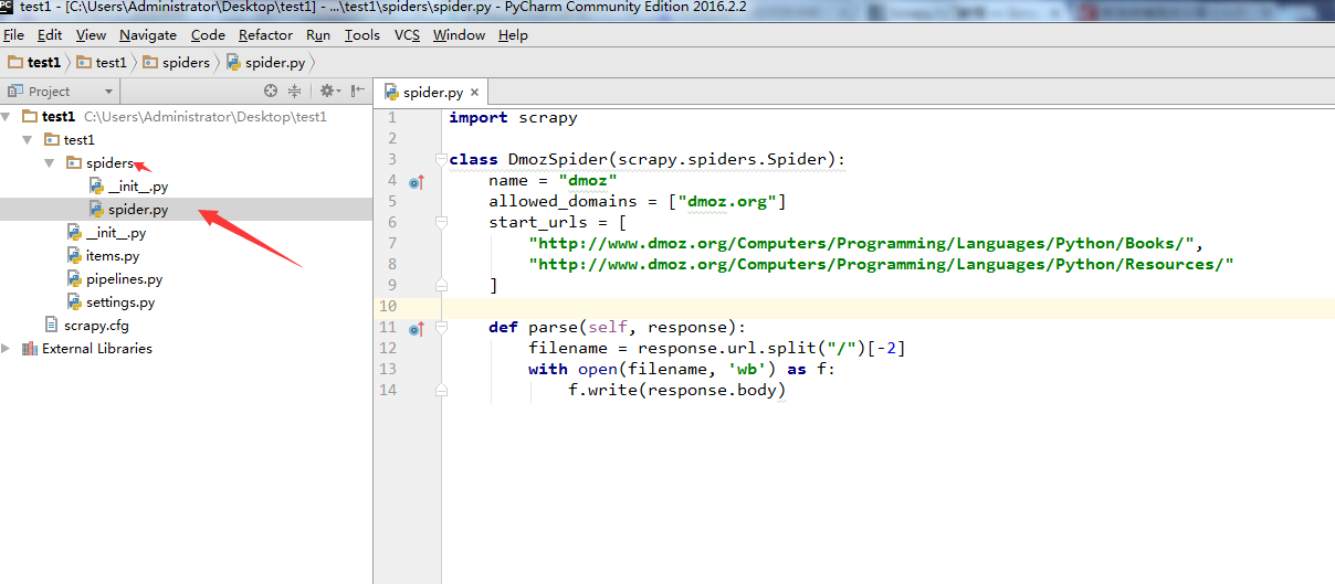 在test1/spiders/,文件夹下,新建一个爬虫spider.py, 注意代码中的name="dmoz"。这个名字后面会用到。