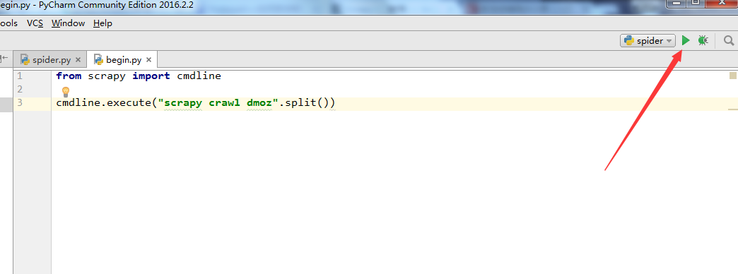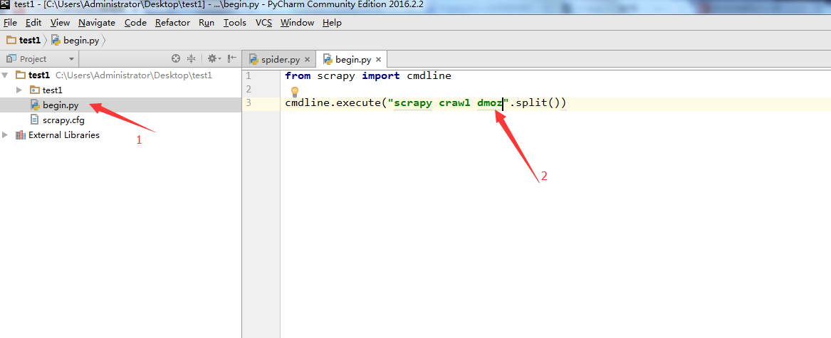 在test1目录和scrapy.cfg同级目录下面,新建一个begin.py文件(便于理解可以写成main.py),注意箭头2所指的名字和第5步中的name='dmoz'名字是一样的。