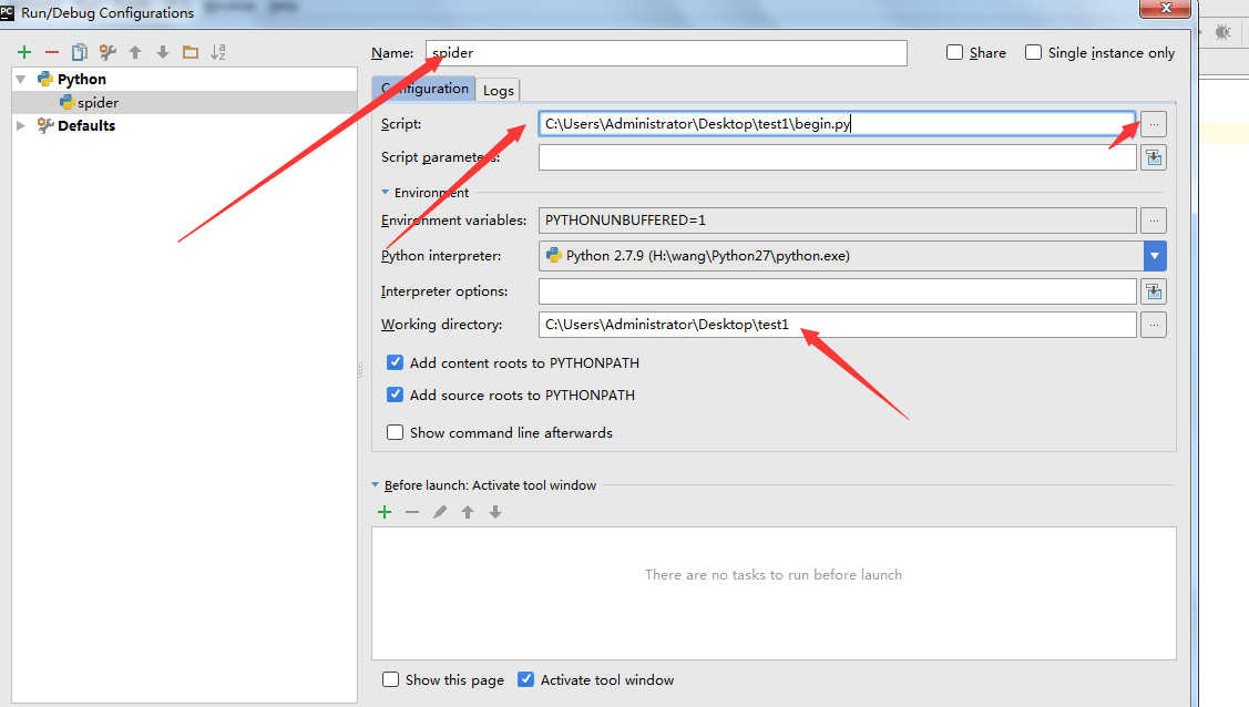 9. Name:改成spider; script:选择刚才新建的那个begin.py文件;Working Direciton:改成自己的工作目录