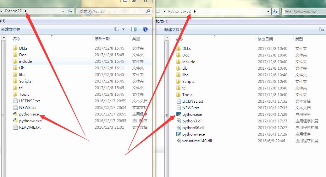 python2.7,python3.6同时安装,于是问题来了,python27与python36文件夹下的文件名都是python.exe