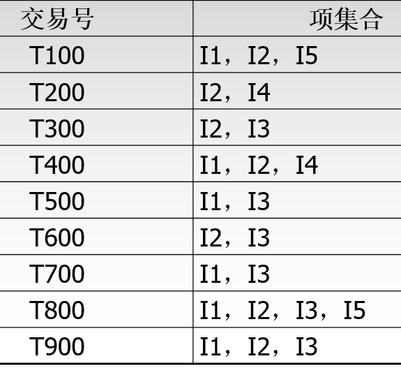 上表第一行(第一项交易)表示:I1和I2和I5一起被购买。