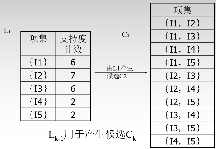 C2至L2的过程: 只需查看支持度是否高于阈值,然后取舍。