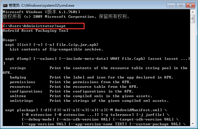 4.打开cmd,输入aapt出现如下界面,说明环境OK了