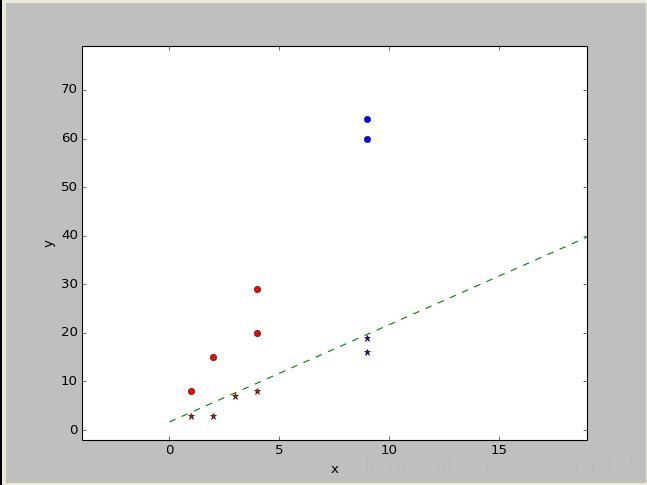 import numpy as np import pylab as pl b=1 #偏置 a=0.3 #学习率 x=np.array([[b,1,3],[b,2,3],[b,1,8],[b,2,15],[b,3,7],[b,4,29],[b,4,8],[b,4,20]]) #训练数据 d=np.array([1,1,-1,-1,1,-1,1,-1]) #训练数据类别 w=np.array([b,0,0]) #初始w def sgn(v): if v>=0: return 1 else: return -1 def comy(myw,myx): return sgn(np.dot(myw.T,myx)) def neww(oldw,myd,myx,a): return oldw+a*(myd-comy(oldw,myx))*myx for ii in range(5): #迭代次数 i=0 for xn in x: w=neww(w,d[i],xn,a) i+=1 print w myx=x[:,1] #绘制训练数据 myy=x[:,2] pl.subplot(111) x_max=np.max(myx)+15 x_min=np.min(myx)-5 y_max=np.max(myy)+50 y_min=np.min(myy)-5 pl.xlabel(u"x") pl.xlim(x_min,x_max) pl.ylabel(u"y") pl.ylim(y_min,y_max) for i in range(0,len(d)): if d[i]==1: pl.plot(myx[i],myy[i],'r*') else: pl.plot(myx[i],myy[i],'ro') #绘制测试点 test=np.array([b,9,19]) if comy(w,test)>0: pl.plot(test[1],test[2],'b*') else: pl.plot(test[1],test[2],'bo') test=np.array([b,9,64]) if comy(w,test)>0: pl.plot(test[1],test[2],'b*') else: pl.plot(test[1],test[2],'bo') test=np.array([b,9,16]) if comy(w,test)>0: pl.plot(test[1],test[2],'b*') else: pl.plot(test[1],test[2],'bo') test=np.array([b,9,60]) if comy(w,test)>0: pl.plot(test[1],test[2],'b*') else: pl.plot(test[1],test[2],'bo') #绘制分类线 testx=np.array(range(0,20)) testy=testx*2+1.68 pl.plot(testx,testy,'g--') pl.show() for xn in x: print "%d %d => %d" %(xn[1],xn[2],comy(w,xn))