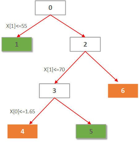 2 [label="X[1] <= 70.0000\nentropy = 0.650022421648\nsamples = 6", shape="box"] ;