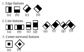 在扫描待检测图片的时候,以边界特征中的(a)为例,正如前面提到的那样,计算机中的图片是一个数字组成的矩阵,程序先计算整个窗口中的灰度值x,然后计算矩形框中的黑色灰度值y,然后计算(x-2y)的值,得到的数值与x做比较,如果这个比值在某一个范围内,则表示待检测图片的当前扫描区域符合边界特征(a),然后继续扫描。