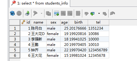 ((1, '陈月白', 'male', 25, '20176666', '1351234'), (2, '王大花D', 'female', 19, '19920816', '10086'), (3, '李强新', 'male', 18, '19941025', '10000'), (4, '王鹏', 'male', 20, '19970405', '10010'), (5, '钟齐', 'male', 22, '19970420', '123456789'), (6, '王大花', 'female', 15, '19981024', '12345678'))