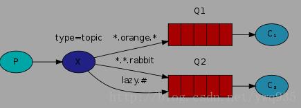 相较于direct,topic能实现模糊匹配式工作方式(在consumer端指定匹配方式),只要routing key包含指定的关键字,则将该msg发往绑定的queue上。