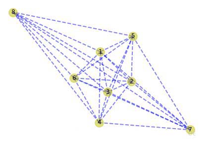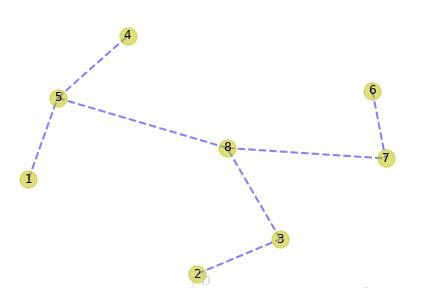 import matplotlib.pyplot as plt import networkx as nx g_data = [(1, 2, 1.3), (1, 3, 2.1), (1, 4, 0.9), (1, 5, 0.7), (1, 6, 1.8), (1, 7, 2.0), (1, 8, 1.8), (2, 3, 0.9), (2, 4, 1.8), (2, 5, 1.2), (2, 6, 2.8), (2, 7, 2.3), (2, 8, 1.1), (3, 4, 2.6), (3, 5, 1.7), (3, 6, 2.5), (3, 7, 1.9), (3, 8, 1.0), (4, 5, 0.7), (4, 6, 1.6), (4, 7, 1.5), (4, 8, 0.9), (5, 6, 0.9), (5, 7, 1.1), (5, 8, 0.8), (6, 7, 0.6), (6, 8, 1.0), (7, 8, 0.5)] def draw(g): pos = nx.spring_layout(g) nx.draw(g, pos, \ arrows=True, \ with_labels=True, \ nodelist=g.nodes(), \ style='dashed', \ edge_color='b', \ width=2, \ node_color='y', \ alpha=0.5) plt.show() g = nx.Graph() g.add_weighted_edges_from(g_data) tree = prim(g, 1) mtg = nx.Graph() mtg.add_edges_from(tree.items()) mtg.remove_node(None) draw(mtg)